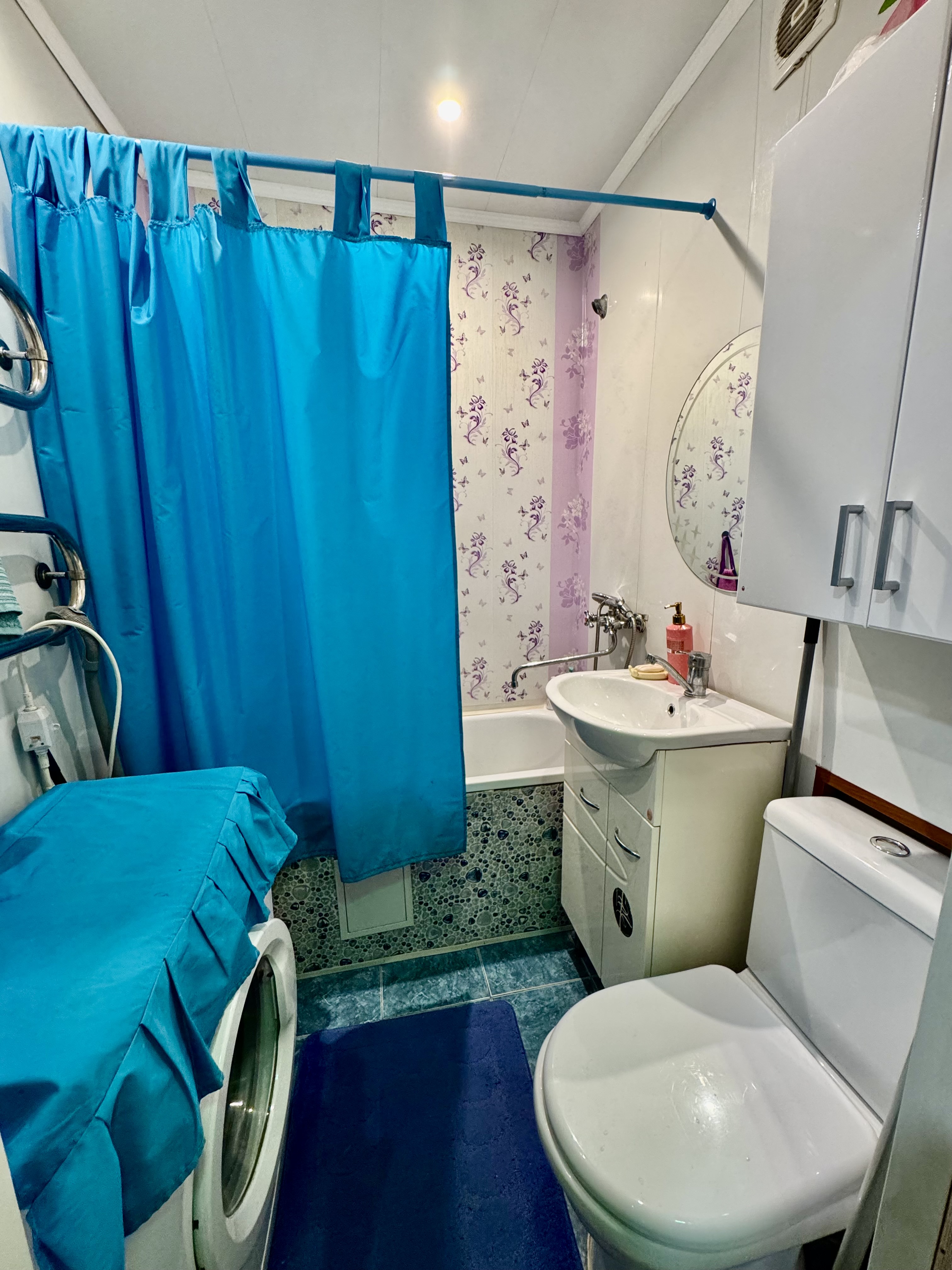 Обновлённый санузел: совмещённый, отделан ПВХ-панелями