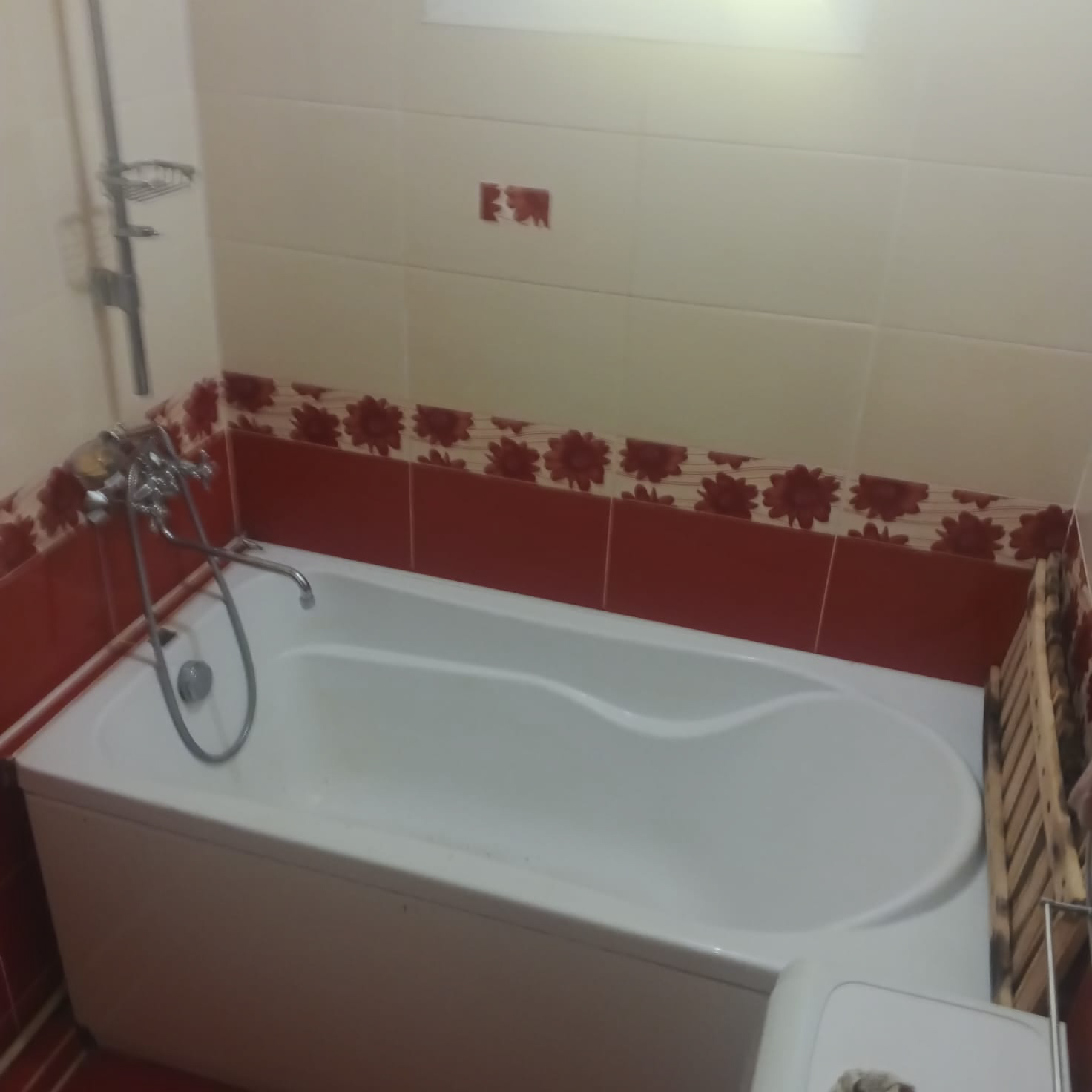 Кухня и санузел с плиткой в тёплых тонах — практично и стильно.