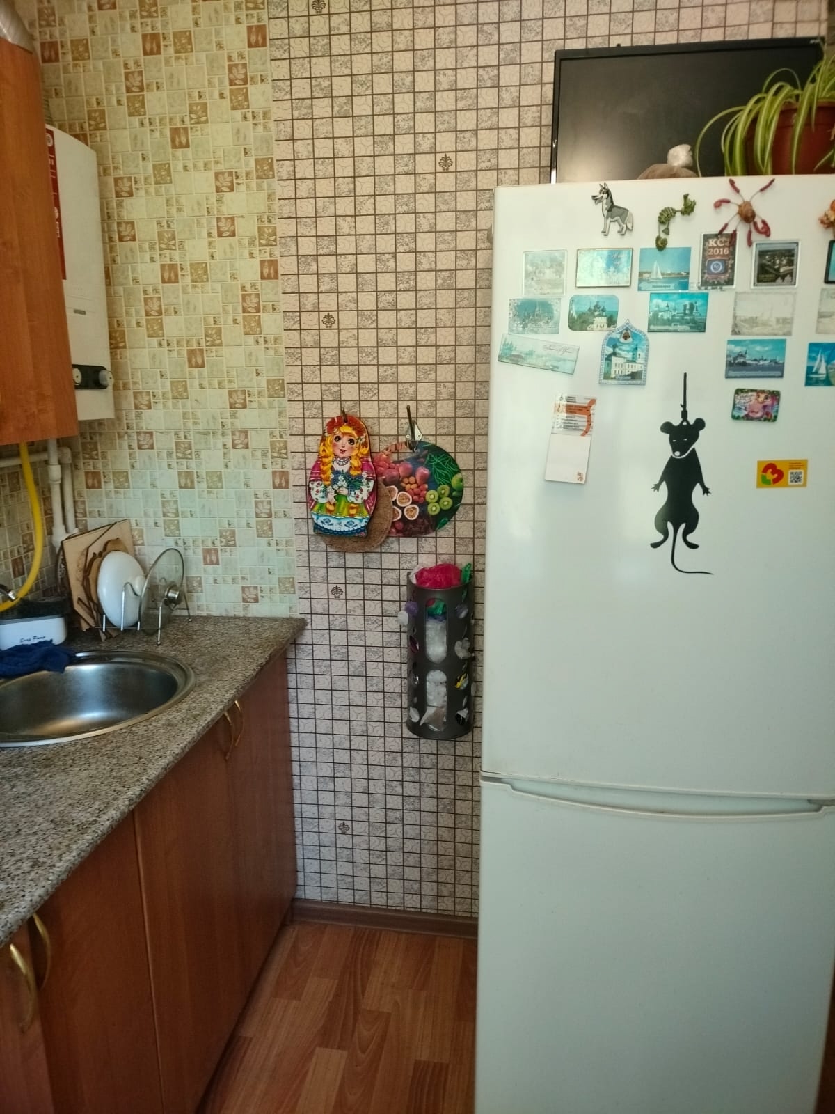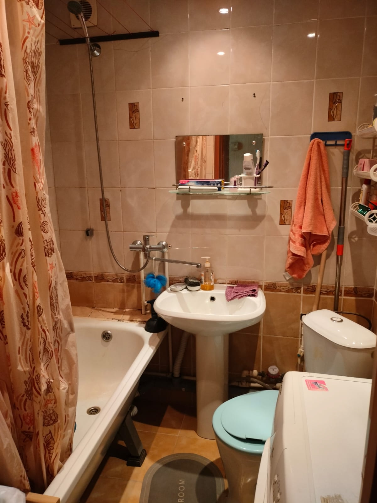 Санузел совмещенный, стены - кафель, установлены счетчики на воду, трубы пластик.